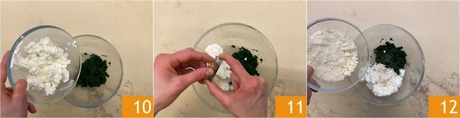 Place the chopped spinach in a bowl, add the ricotta 10, salt, pepper, and nutmeg 11. Also add the grated Parmigiano Reggiano DOP 12.