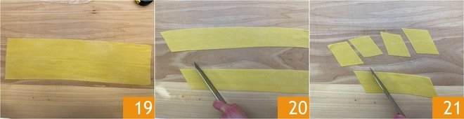 Roll it out with a pasta machine 16; as you reduce the thickness, fold the dough over itself 17 and roll it out again 18.