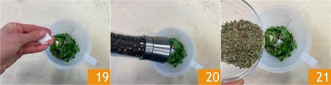 Salt 19, pepper 20, and finally add dried oregano 21.