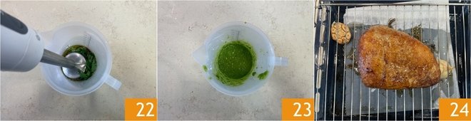 Blend with an immersion blender 22 to obtain a smooth sauce 23. When the picanha is ready, take it out of the oven and let it rest for 10 minutes before slicing it 24; this will help keep the juices inside the meat.