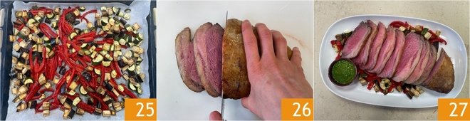 Meanwhile, the vegetables will also be ready 25, slice the meat 26, and serve your picanha in the oven with the vegetables and chimichurri sauce 27.