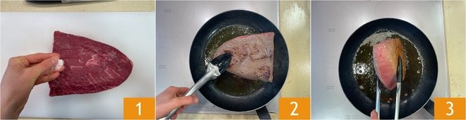 To prepare the picanha, salt the meat on both sides 1. In a skillet, heat a swirl of olive oil and sear the picanha over medium-high heat 2 for 2-3 minutes on each side 3, to get a golden crust.