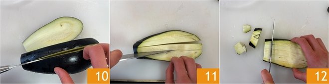 Trim the eggplants and cut them into slices about 0.4 inches thick 10, then slice into sticks of the same thickness 11, and finally cut into cubes 12.