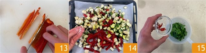 Clean the bell peppers and cut them into sticks of 0.4 inches 13. Now gather the vegetables on a baking sheet lined with parchment paper and season them with oil, salt, and pepper 14. Also, put the vegetables in the oven and bake for 20 minutes. Meanwhile, prepare the chimichurri sauce: in a container, pour the parsley and chili pepper 15.