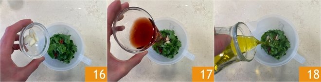 Add the garlic 16, red wine vinegar 17, and olive oil 18.