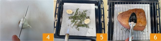 Cut the garlic head horizontally 4, place it on a baking sheet lined with parchment paper along with rosemary, thyme, and sage. If you prefer, you can heat the herbs with a blowtorch to intensify the flavor 5. Place the picanha on a rack positioned above the herbs so that the fat can drip onto the sheet below 6.