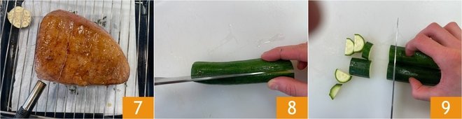 Char the meat with the blowtorch for a smoky effect 7. Cook in a preheated fan oven at 356°F for 30 minutes. Meanwhile, prepare the side dish: trim the zucchini and cut them in half lengthwise 8, then slice into half-moons 9.