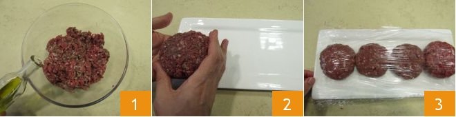To prepare the Piedmontese burgers, start with the meat. Pour the meat into a bowl and garnish with a dash of oil 1. Mix well and shape into the classic patty form, which should weigh about 6 oz; repeat this for all, placing them on a plate 2. Cover with plastic wrap and let them firm up in the fridge for about half an hour 3.