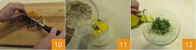 Meanwhile, finely chop with a knife the desalted capers, anchovy fillets, and peeled garlic clove with the core removed, so you get a rich and aromatic paste; finally, chop the parsley as well 10. At this point, everything is ready. In the bowl with the yolks, add the aromatic paste, squeezed crumbs 11, and parsley, and mix everything. Finally, add the oil and mix again. Your green sauce is ready; keep it aside 12.