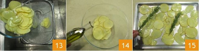 Take the potatoes, drain them, and then pat them dry well 13. Pour them into a bowl and season with oil, salt, and pepper 14, and finally arrange them on a slightly oiled baking sheet, and place 2 rosemary sprigs on top. Bake in a preheated ventilated oven at 340°F for 20 minutes 15.