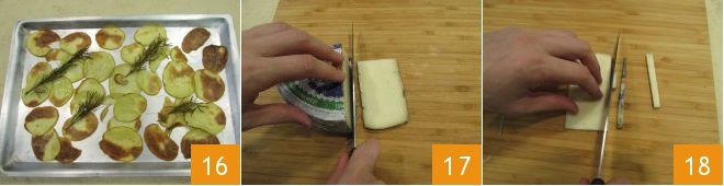When cooked, set them aside 16. Meanwhile, slice the Piedmontese toma cheese into 4 thin slices 17 and remove the outer part 18.