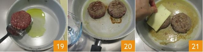 In a pan, heat a little oil, in the meantime, take the burgers and remove the plastic wrap, season with salt and pepper on both sides. Cook them over medium-high heat for 4 minutes 19, then turn them and add a dash of water to the bottom of the pan 20, then place the toma cheese on the patties 21