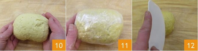 Continue kneading until you get a compact dough and shape it into a loaf 10. Wrap the obtained loaf with plastic wrap 12 and let it harden in the refrigerator for at least 2 hours. After the resting time, take the dough and with a dough scraper divide it into pieces about 0.4 inches wide 12.