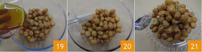 Gather the pignolata in a bowl and pour honey over it 19 while the morsels are still hot, stir to mix the honey 20, transfer the honey-coated pignolata to a serving plate and decorate with colorful sprinkles to your liking 21!