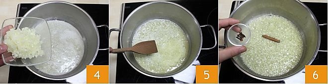 Add the chopped onion to the melted butter and let it sweat on low heat 4 for about 15 minutes, until it becomes translucent: be careful not to let it color 5. Add the cinnamon and cloves 6 and stir for another two minutes.
