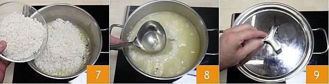 Then add the rice 7 and toast it. Add all the broth, already salted 8. Cover the pan with a lid (it must be airtight) 9 and let it cook for at least 18-20 minutes over medium heat until the broth is completely absorbed.