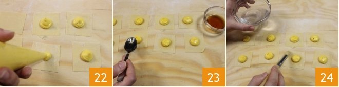 Pour the pumpkin and fossa pecorino filling you blended into a piping bag and fill the egg pasta squares you cut 22. Then add the herbal bitters infused with lemon, and using a teaspoon, place a drop on each bundle 23. Brush the egg pasta squares with water to facilitate sealing 24.
