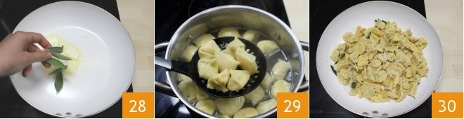 In the meantime, melt the butter in a non-stick pan and add a few sage leaves 28. When the pinched bundles float to the surface, drain them with a slotted spoon 29 and sauté them in the pan with the butter and sage. Sprinkle with grated pecorino, and the pinched bundles with pumpkin and fossa pecorino are ready to be served and enjoyed 30!
