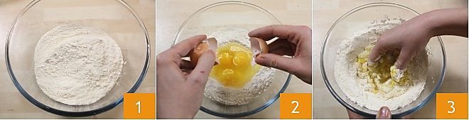 To prepare the pinched bundles with pumpkin and fossa pecorino filling, start by making the egg pasta. Pour the all-purpose flour into a large bowl 1, or directly onto a floured pastry board, add the eggs 2, and start kneading by hand 3.