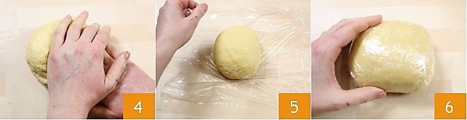Transfer the dough to a floured pastry board, if you started working it in a bowl, and continue kneading 4 until you obtain a firm and compact dough ball 5. Then cover the dough ball with a sheet of plastic wrap 6 and let it rest at room temperature for 1 hour. To learn how to prepare egg pasta at its best, consult the Cooking School: Homemade pasta (sheets and shapes).