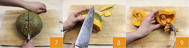 In the meantime, take care of the pumpkin: place it on a cutting board and cut it in half 7. Then take one half, remove the skin laterally with a knife 8 and extract the internal seeds using a spoon 9.
