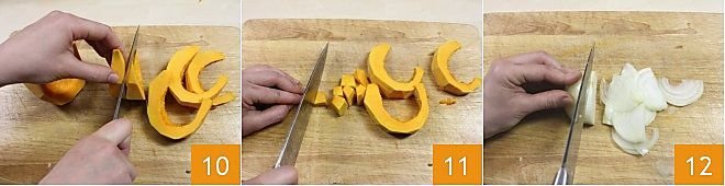 Then slice the half pumpkin 10 and cut the slices into cubes 11. Take half an onion, peel it, and chop it finely 12.