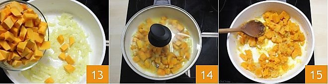 Pour a drizzle of oil into a non-stick pan and sauté the chopped onion over low heat. When the onion is golden brown, add the pumpkin cubes 13. Cover with a lid and cook over low heat for about 30 minutes, adding water or broth as needed 14. Let the pumpkin cubes dry well, otherwise, they will release too much water when blended 15.