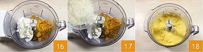 Once cooked, transfer the pumpkin to a mixer with the ricotta 16. Also, add the fossa pecorino you previously grated 17 and adjust salt and pepper to taste. Blend everything until you obtain a homogeneous cream 18.