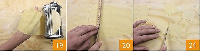After the resting time of the dough, roll it out with a pasta machine: first, cut a piece of the dough ball, so that it can pass more easily through the machine. Flatten the piece you cut with your hands and set the side knob of the machine to the widest thickness. Pass the pasta through several times and as it becomes thinner, reduce the machine's thickness until you get a thin sheet 19. Consult the Cooking School: rolling out the sheet with the machine, which you can find here, to discover all the steps of this process. Once the pasta is rolled out, cut it into squares measuring approximately 2x2 inches (20-21).