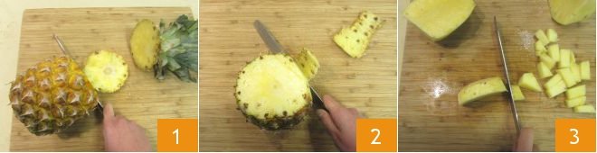 To prepare pineapple jam, first make sure you have new lids and sanitized jars (following the Ministry of Health guidelines provided at the end of the recipe). Start by cleaning the fruit: cut off the top and bottom ends 1, then place the pineapple vertically on a cutting board and remove the peel with a knife 2. Finally, cut the pineapple into chunks, avoiding the tougher central part 3: you should get about 1 lb of cleaned pineapple (for more information, you can read our guide on how to clean and cut pineapple).