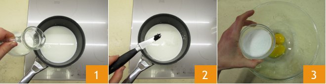 Move on to the custard. In a saucepan, pour the milk, cream 1, the scraped vanilla seeds 2, and the pod. Bring to a near boil. Meanwhile, in another bowl, pour the egg yolks and sugar 3,