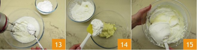 Pour the cold cream into a large bowl, turn on the mixers at medium-high speed, and add the powdered sugar one tablespoon at a time 13. Beat until you have a stiffly whipped mixture. At this point, turn the custard into a diplomatic cream by adding half of the whipped cream first and stirring vigorously to temper 14. Then add the remaining part and incorporate more gently with movements from the bottom to the top 15.