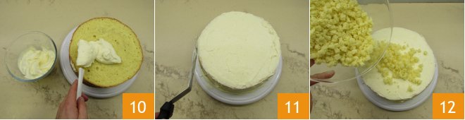 Transfer the reserved cream onto the cake 10 and cover the cake entirely by smoothing it well 11, sprinkle with all the cubes 12
