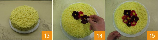 and gently compact with your hands to entirely cover the whole surface 13. Let it set in the refrigerator for 3-4 hours, and then garnish with edible flowers 14 before serving 15. Your pineapple mimosa cake is ready.