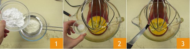 Add the sugar and beat everything for at least 10 minutes at medium speed until the mixture is fluffy, light, and frothy 5. Stop the mixer, place a strainer in the bowl and sift the flour and potato starch mixture again 6.