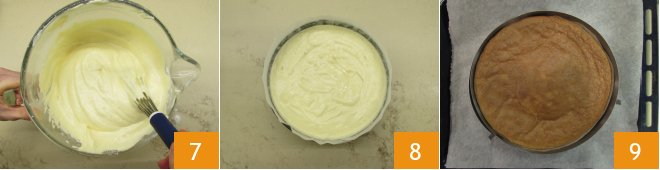 Carefully level with a spoon 7 and place the previously set aside disc on top: put the more browned side in contact with the pineapple cream 8. Moisten the surface of the cake as well 9.