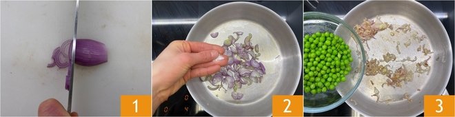 To prepare the pinsa with gorgonzola, start with the pea cream: trim and thinly slice the shallot 1, then add it to a pan with a drizzle of oil and a pinch of salt 2 and let it sweat over low heat. After about 8 minutes, add the peas 3, season with salt and sauté them for about 5 minutes.