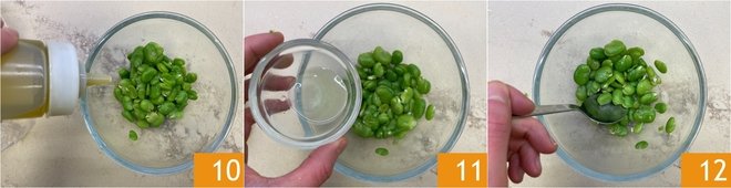 Toss the fava beans with olive oil 10, salt and lemon juice 11. Mix well 12 and set aside.