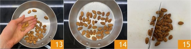 Finally, deal with the almonds: put them in a pan 13 and toast over medium heat for about 7–8 minutes 14. After letting them cool, roughly chop them with a knife 15.