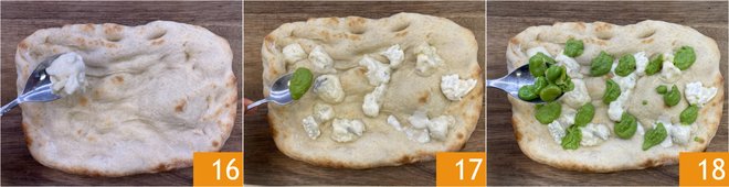 Now heat the pinsa base in a convection oven preheated to 482°F for 5 minutes. Remove from the oven and top with dollops of gorgonzola 16 and pea cream 17, then distribute the fava beans 18.