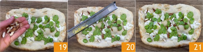 Also add the toasted almonds 19 and the grated lemon zest 20. Your pinsa with gorgonzola is ready to be enjoyed 21!