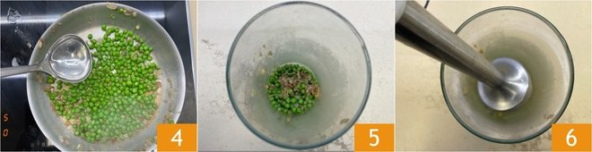 At this point, moisten with a couple of ladles of water 4 and continue cooking for another 2–3 minutes. Transfer everything to a jug 5 and blend with an immersion blender 6 to obtain a smooth cream.