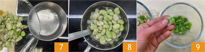 Set aside and move on to the fava beans: blanch them in salted water for 3 minutes 7, then drain 8 and let cool. Once warm, remove the skins 9.