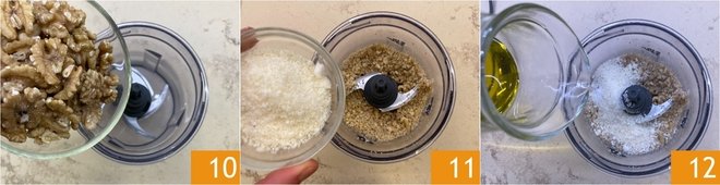 Finally prepare the walnut pesto: put the remaining 130 g of walnuts in a food processor 10 and blend them until finely chopped, then add the grated Grana Padano 11 and the oil 12.