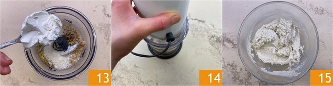 Add the ricotta as well 13 and blend again 14 to obtain a smooth mixture 15. If the texture is too thick, you can thin it with a little splash of water.