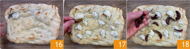 At this point heat the pinsa base in a preheated convection oven at 482 F for 5 minutes, then distribute small dollops of the walnut pesto on the surface 16, the radicchio 17 and the crispy speck 18.