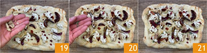 Finish with the toasted walnuts 19 and a few thyme leaves 20. Your radicchio, speck and walnut pinsa is ready to be served 21!