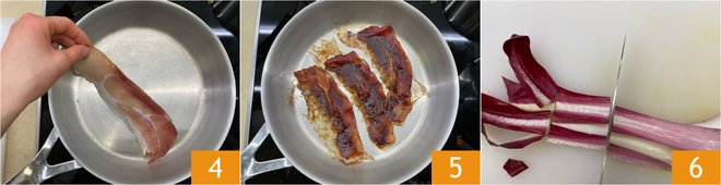 In the same pan place the slices of speck 4 and sear over medium heat for about ten minutes, or until they become nicely crispy 5. Meanwhile, cut the radicchio into pieces about 2 inches long 6.