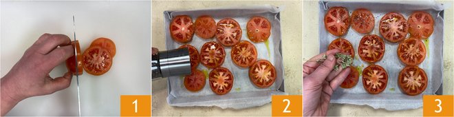 To prepare the pinsa with roasted tomatoes, burrata and cooked ham, start with the tomatoes. After washing and drying them, slice them into rounds about 3/8 inch (1 cm) thick 1. Place them on a baking sheet lined with parchment paper and season with oil, salt, pepper 2 and then oregano 3.