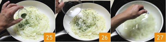 Season the onions with the thyme and bay leaf mixture 25 and the sugar 26, pepper to taste. Cover with a lid 27 and let cook on low heat for about 30 minutes, until the onions become translucent. The onions should not color, so if necessary, deglaze with a few tablespoons of hot water.